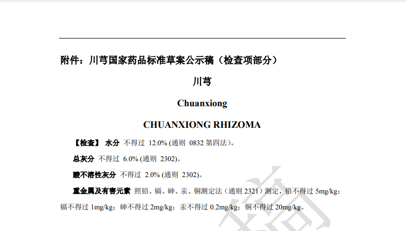 隨著《中藥法典》標(biāo)準(zhǔn)修訂進(jìn)程的推進(jìn),藥典委官網(wǎng)近期陸續(xù)發(fā)布多個(gè)標(biāo)準(zhǔn)公示,均與中藥重金屬及有害元素控制相關(guān)。其中,“關(guān)于黃連國(guó)家藥品標(biāo)準(zhǔn)草案的公示”、“關(guān)于艾葉國(guó)家藥品標(biāo)準(zhǔn)草案的公示”、“關(guān)于川芎國(guó)家藥品標(biāo)準(zhǔn)草案的公示”,對(duì)相關(guān)檢測(cè)項(xiàng)擬進(jìn)行修訂。公示期為30天。通知表示,若有異議,可及時(shí)在線反饋,并附相關(guān)說(shuō)明、實(shí)驗(yàn)數(shù)據(jù)和聯(lián)系方式。