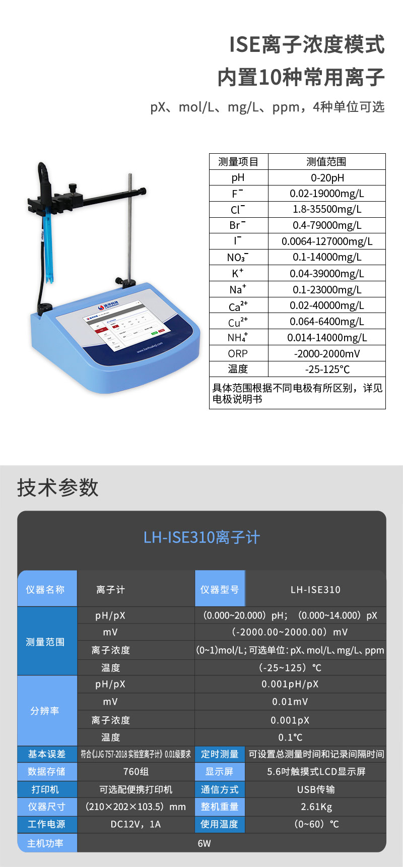 8、ISE離子濃度模式:ISE離子濃度模式內置10種常用離子,可自定義其他離子;pX、mol/L、mg/L、ppm,4種單位可選