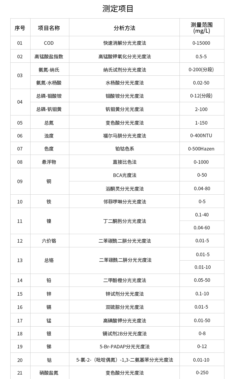 COD高量程:預(yù)制試劑:(20~15000)mg/L(分段);普通試劑:(20~10000)mg/L(分段)